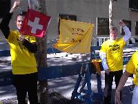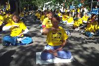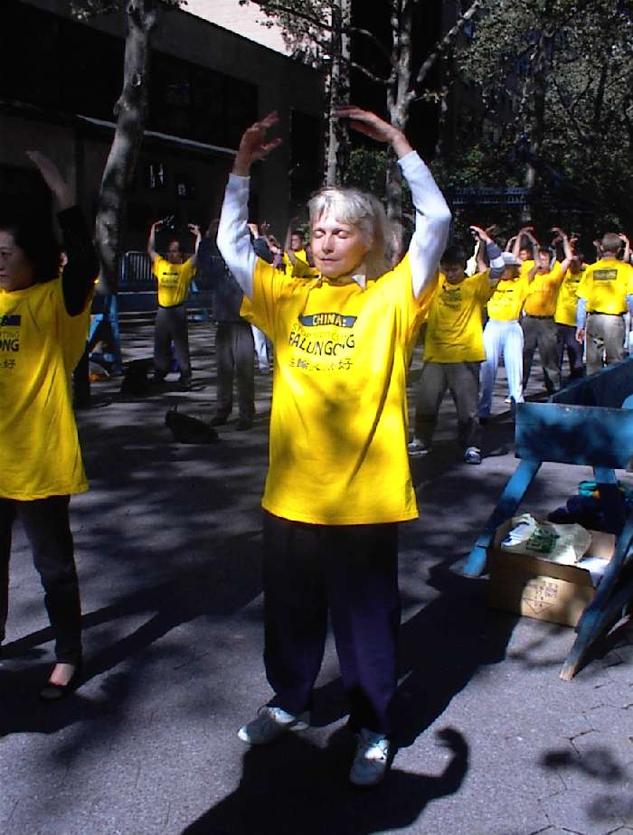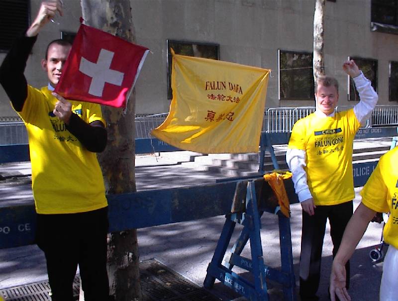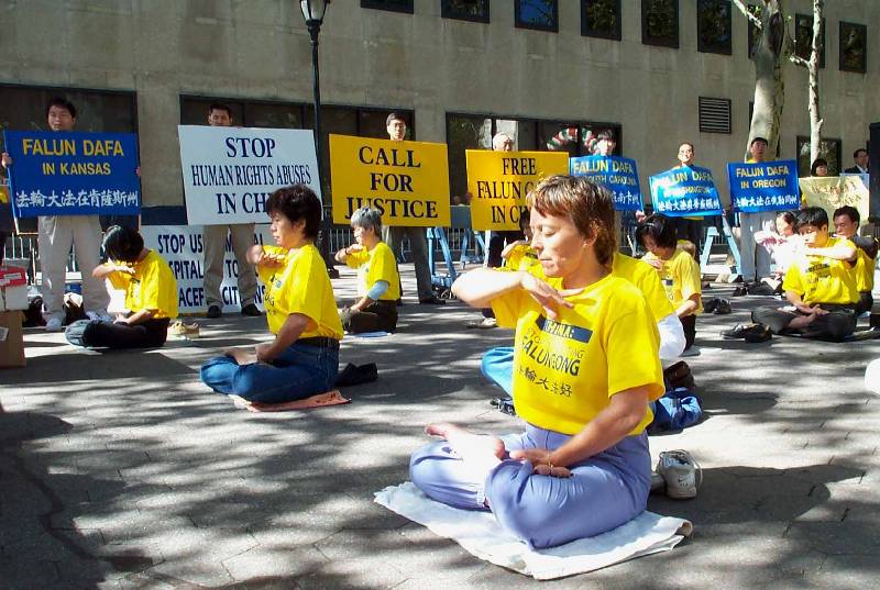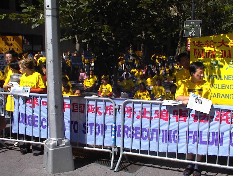 此时右边的台湾人社团突然透过麦克风提及:“在台湾, 我们也有人修炼法轮功,我们支持法轮功”,而左边的伊朗团体也对学员递上的法轮功材料感兴趣地阅读。学员们打坐后即安静地看着大法书籍,个个聚精会神, 似乎希望每分每秒都用在学法上。也有西方学员七、八个主动形成一个圈开始集体学习<<转法轮>>。大家在宁静的学法中结束今天在联合国前的活动。