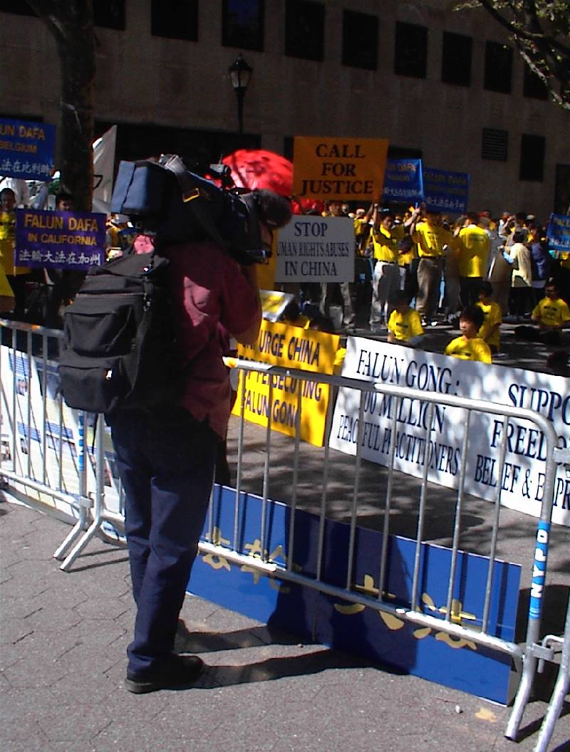 大约十一点左右, 右边的台湾人社团及左边的伊朗社团陆续集合。两边的锣鼓喧天与学员宁静的打坐状态形成了一种强烈的对比。因此原本竞相摄影两边活动的媒体,反倒对法轮功感兴趣, 到处捕捉学员打坐入静的神情。