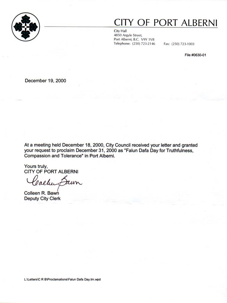 【明慧网2001年1月10日】 加拿大不列颠哥伦比亚省阿尔泊尼港市宣布2000年12月31日为“法轮大法真善忍日”。
