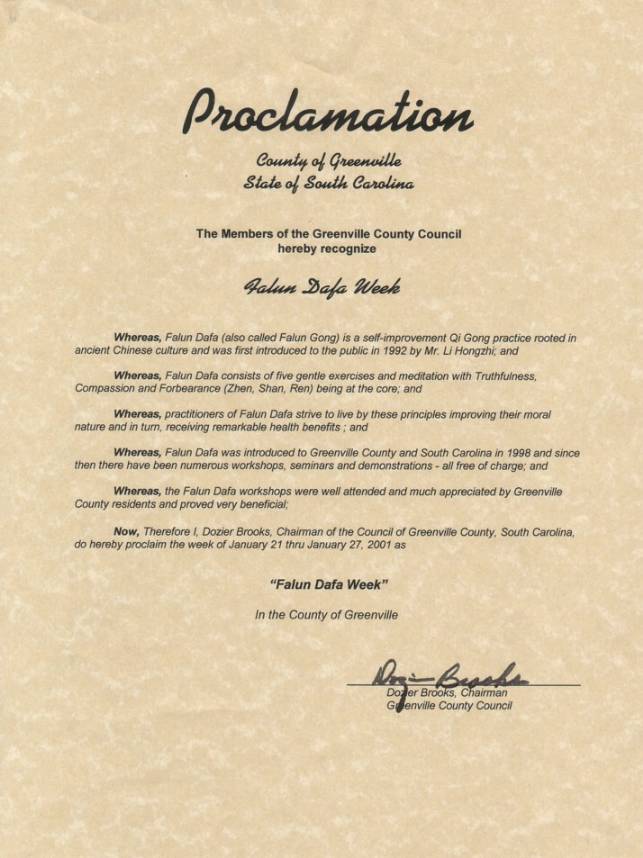 南卡罗来那州格林威尔镇宣布“法轮大法周”