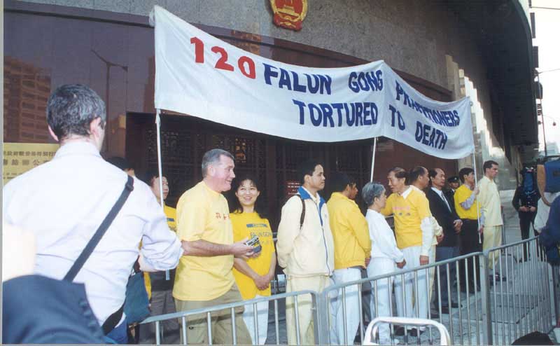 13日下午,学员们游行至中联办(前新华社)对面炼功,呼吁停止镇压法轮功