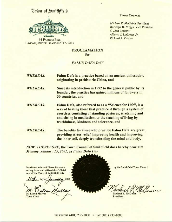 【明慧网2001年1月18日】 罗德岛州史密斯费德镇宣布2001年1月15日为“法轮大法日”