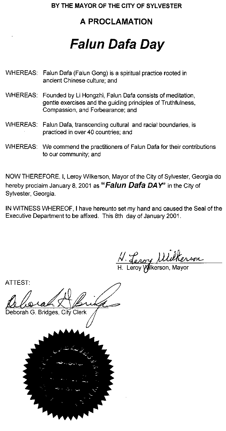 【明慧网2001年1月19日】 乔治亚州西尔维斯特市市长宣布2001年1月8日为“法轮大法日”