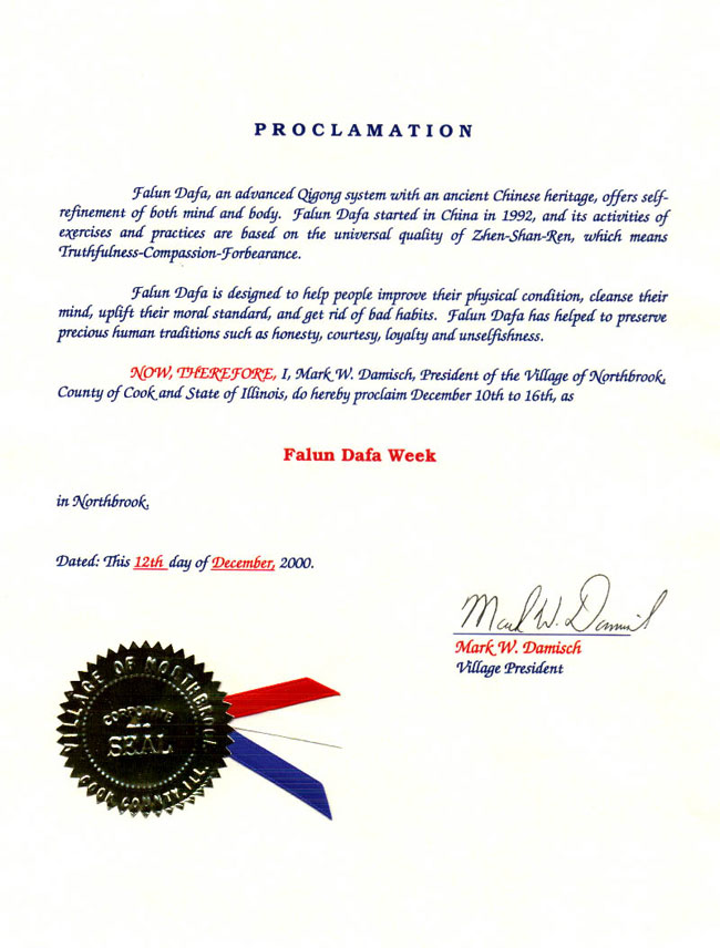 【明慧网2001年1月20日】 伊利诺伊州北布鲁克市(NORTHBROOK)宣布二零零零年十二月十日至十六日为该市的“法轮大法周”。