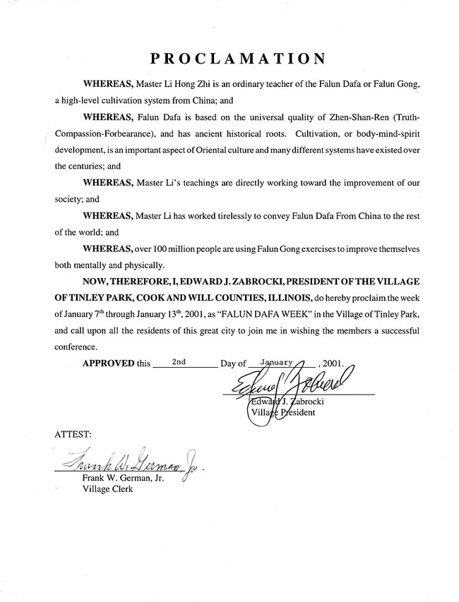 【明慧网2001年1月20日】 伊利诺伊州亭蕾园(Tinley Park)市宣布二零零一年一月二日为“法轮大法周”。