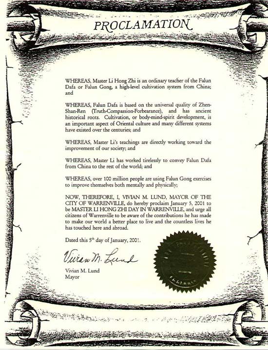 【明慧网2001年1月20日】 伊利诺伊州沃伦维尔(Warrenville)市命名二零零一年一月五日为“李洪志大师日”。并希望所有沃伦维尔市居民关注李洪志大师对世界和无数众生的社会做出的贡献。