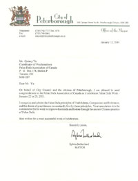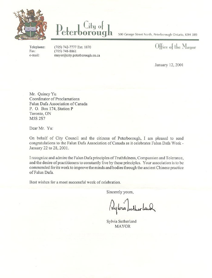 【明慧网2001年1月25日】 加拿大安大略省彼得波罗夫市市长致函加拿大法轮大法佛学会祝贺“法轮大法周”。