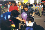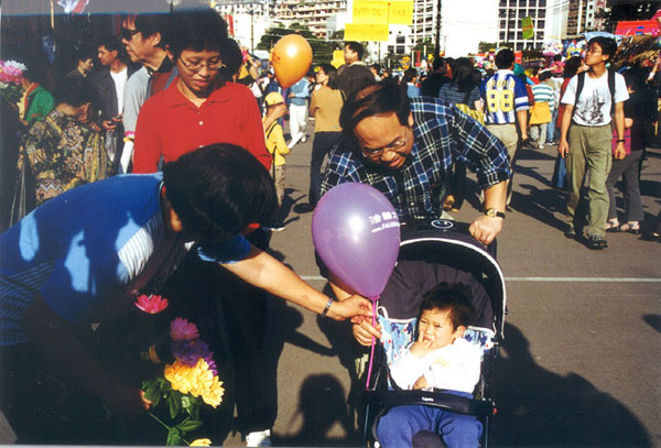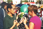 | 维多利亚公园:大多数家长们愿意接过法轮功的气球和莲花给他们的孩子,有的家长甚至教孩子读出“真善忍”三个字,并提醒孩子要记住“真善忍”。 | 维多利亚公园:学员向游客洪法 |