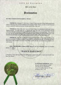 【明慧网2001年1月28日】 得克萨斯州帕萨德纳市宣布2001年1月27日为“法轮大法日”。
