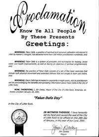 今天是阿肯色州首府小石城的“法轮大法日”。这是继去年7月20日阿肯色州的菲叶维尔(Fayetteville)市宣布“法轮大法日”以来对法轮功的又一官方褒奖。