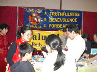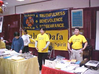 法轮功展台独家设置了投影电视,播放法轮功五套功法,并伴有法轮功学员现场炼功,优美的音乐和动作吸引众多游客伫立观看,不少人对法轮功产生浓厚的兴趣,纷纷上前询问如何学习,几千份中英文免费法轮功学习班传单、法轮功真相报纸等材料一扫而空。
