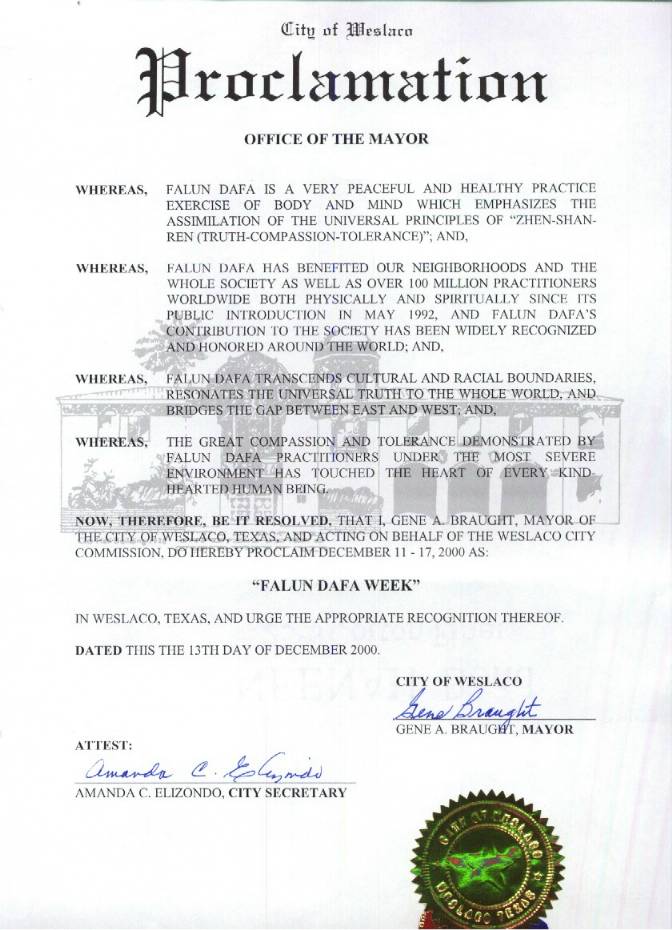 德克萨斯州维斯拉科市宣布“法轮大法周”