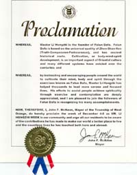 鉴于,通过传授和鼓励全世界范围内的人民习炼法轮大法,从而修炼他们的身体,思想和精神,李洪志大师帮助了数千人过上了宁静而有意义的生活。我对他为帮助人们通过炼功和打坐而获得精神发展所付出的努力而致以深深的谢意。我高兴地同法轮大法修炼者一道褒奖他的众多成就。