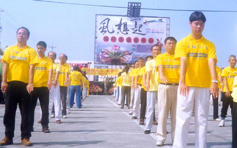 大法弟子百余人于大会的广场下表演五套功法,我们很高兴能够把这千年不遇、万年难遇的功法,带到这么纯朴的地方来,非常希望能够使更多的人得法受益。十点整,大法的音乐从天上响起,大法弟子在酷热的太阳底下,演炼着五套功法,大法弟子展现出了「雷打不动」的真修表现,令大众佩服,大法的威力加上大法粒子与粒子联结起一个庞大的、慈悲的场,整个活动都在很庄严、祥和的场顺利完成,给人们结下了修炼的机缘。