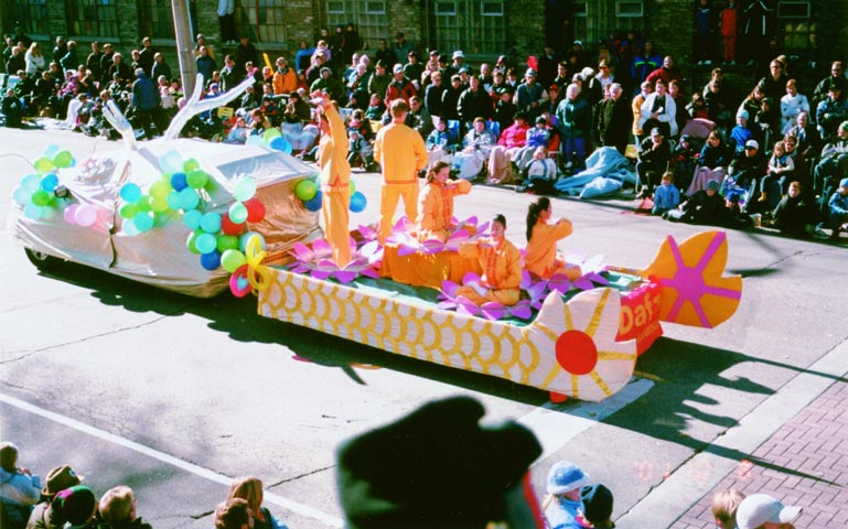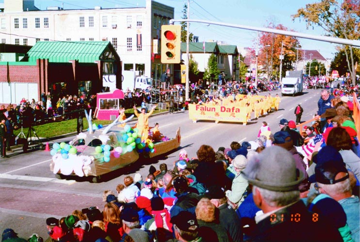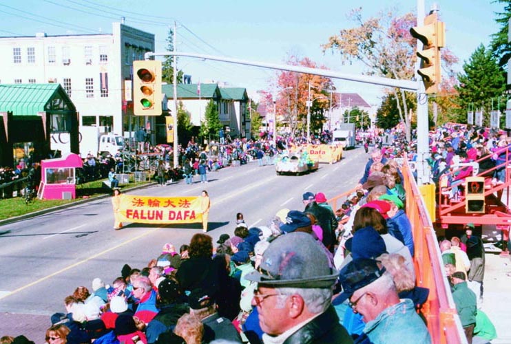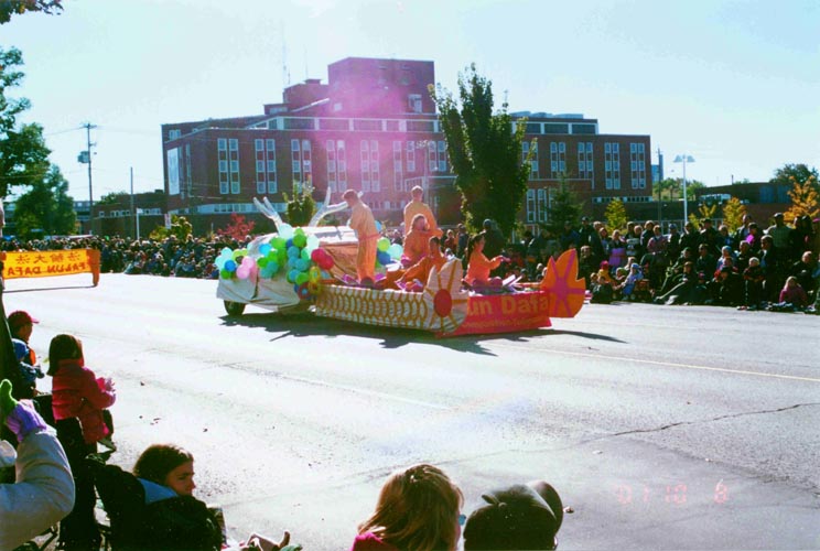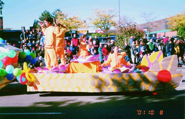 【明慧网2001年10月11日】十月八日是加拿大滑铁卢地区传统的庆丰收的节日,一年一度的感恩节大游行也在这一天举行。今年已经是第三十三届了,约有十几万观众,并有两家电视台现场直播这次游行,这正是洪法讲清真相的好机会。
