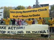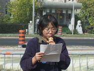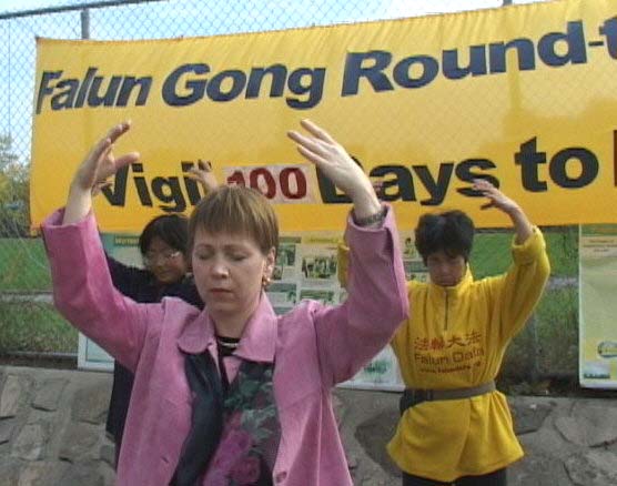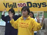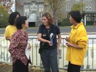 学员们首先简单回顾了自7月6日开始的由吉瑞.史密斯率先发起的24小时呼吁紧急营救中国受迫害的法轮功学员的连续和平请愿的一百个日日夜夜,并特别提到8月21日以来,学员用生命呼唤正义良知的绝食壮举,以及加拿大社会各界善良民众,包括国会议员,非政府组织,各级工会,学校,知识界及各界民众对我们的支持和声援。接着参与静坐与绝食的部分学员洁思明、智静、 玛丽、关超尘等就各自的行动作了简短的发言。部分西人学员也发了言。一名来自蒙特利尔的学员讲述了她在国内,因坚信法轮大法而遭受的迫害,她被关押30天期间,因绝食抗议而被捆住手脚强制灌食,夏天,警察还故意打开窗户让学员们暴露在蚊虫叮咬之中。