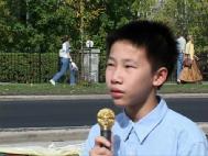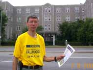 | 曾在使馆前绝食四天的学员。 | 学员在使馆前宣读声明。 |
