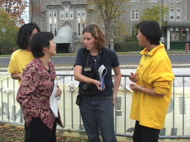 | 法语报采访曾在国内被关押30天、绝食期间被强行灌食的学员。 | CTV/CJOH电视台记者和学员交谈 |