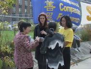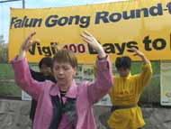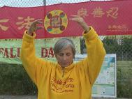 今天的风特别大,以致几乎将草坪边上的护栏吹倒,活动一度停顿。学员们停下来集体发正念,清除邪恶,不到一分钟,风就停了。有两家当地的媒体迟到了两个多小时,当学员们即将离去时,他们才赶到。学员们毫无怨言地重新排列好,以整齐优雅的炼功动作迎接采访。其中一家著名媒体的记者直冲我们竖大拇指,连连赞叹说,“100天,了不起!”虽然遇到了一些干扰,但经过大家的不懈努力最终使整个纪念活动圆满结束。