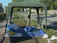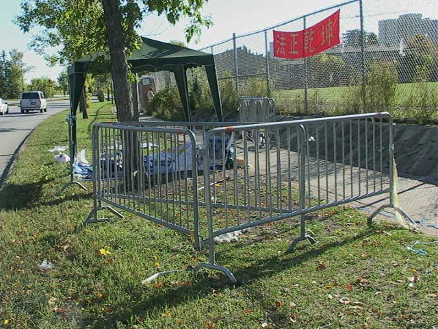 惧怕真相、害怕真理的邪恶,曾偷录音机等、多次黑夜偷横幅标语、甚至撕破横幅标语破坏现场,企图用各种卑劣手法阻止我们的静坐。但这都是徒劳的。大使馆多次派人给学员摄像、威胁谈话等都动摇不了学员的坚定正念。