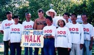 下午2点半,四名大法弟子和两名新学员告别了在场的人们,背着大法资料和SOS紧急援救的传单,举着“法轮大法真善忍”和“中国政府立即停止镇压法轮功”及“SOS紧急救援中国法轮功修炼者”的标语,从市中心广场(DAM广场)起程,开始了历时10天,280公里的行程。