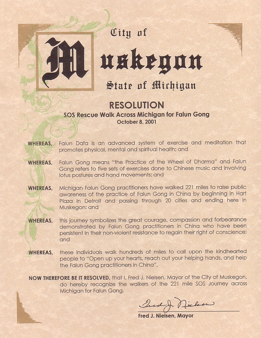 现因此决定,我,马斯基根市市长弗雷德J.内尔森,特此褒扬为法轮功而穿越密西根州、完成221英里紧急救援旅程的步行者们。