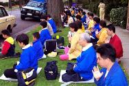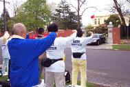 九月三十日(星期日),早晨七点前,两地的学员已来到了中国领事馆门前,在静静的马路边,对着中领馆的路对面人行道上八十八名学员坐在窄窄的空草地上,在三个整点时齐发正念。期间,学员们持续集体炼功。一切都在静静地进行,这里的清晨还依然宁静如初,只是从此过路的人们无不为此处无声胜有声的强大气势所震撼。一名早起的老妇人激动的说:“今天来了这么多的人,还这么安静”。在这期间领馆内的车子开进开出了好几次。这么多的好人,这么祥和的场,他们人的明白的一部份一定会有所感动。