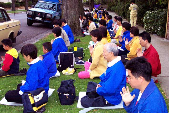 下午二点多钟,台湾学员从机场直接来到费兹罗(FITZROY)公园,他们经过长途的旅行没有休息,就以饱满的精神投入到洪法活动之中。他们一下车,就在公园前的大草坪上与墨尔本学员一道炼功,由于队伍的壮大,其气势吸引着许多游客驻足观看拍照。炼功完毕,学员们开始从公园步行至市中心商业区进行“SOS”步行活动,他们每人都手拿资料,在行进中向世人发送,他们的认真与真诚缩小了语言上的障碍,许多西人从他们手上高兴地拿到了大法的资料。下午,我们又一起赶到保克丘(BOXHILL),两地学员在那里举行一个经验交流座谈会。原订一间的房间已容不下如此众多的学员,只好再增加一间,学员们分成六组,大家围坐在一起争相讲述自己在修炼中的感受和体悟,直到晚上八点台湾学员才找住地休息。
