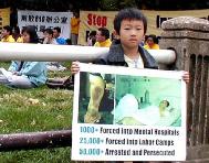 | 中国大使馆前召开紧急新闻发布会 | 小弟子的呼吁 | 弟子在会场外举着“解散610办公室,法办罗干!”的标语 |