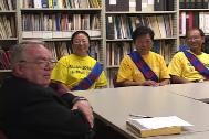 早晨第一位会见学员的是麦克优先生,他对学员们的巨大付出表示感谢,并送给每一位学员一枚圣塔克莱尔郡徽。麦克优先生指着徽章上的桥对学员说,“你们的行动在我们之间建立了一座桥梁,使我们能够共同努力制止在中国发生对法轮功学员的迫害”。