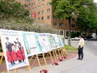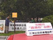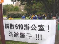 下午时分,学员打出刚刚赶制的横幅:“解散610办公室,法办罗干”。西方善良的群众们了解到真相后,他们为中国毫无人权的可怕现状而震惊,为大陆正在由江泽民犯罪集团推行的国家恐怖主义而愤慨,他们惊叹那些杀人刽子手们的阴险与无耻,他们惊叹“真善忍”在中国竟被镇压,修“真善忍”的好人在中国竟会被活活摔死。