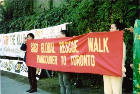与此同时,由两名温哥华弟子和三名多伦多弟子组成的“SOS!全球步行救援行动”加拿大西部小组,举行出发仪式,准备用两个月的时间走完温哥华至卡尔加里的数百公里路程。“SOS!”步行小组的代表发言说:“我们步行,是为了救度众生;我们步行,是为了制止虐杀;我们步行,是为了世界有永久的和平;我们步行,是为了拯救在中国被关押的、随时可能失去生命的同修。”学员们表示,要用自己的真心和汗水,唤起世间的正义良知,把宇宙真理“真善忍”传遍千家万户。