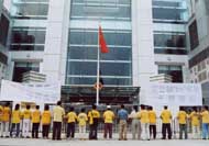一大早5时半,约二十名学员来到了中联办正门前,摆放好横幅、图片,一辆小推车上整整齐齐地摆放着各种真相资料。学员随后在现场炼功和发正念。集体请愿约定在9时进行,事前已通知了警方。大约到8时半,一些警察到场,并用铁栏杆把中联办正门对开人行道围起了一大半。9时前近50名学员到场。学员早已通知警方,我们准备在中联办正门正中的旗杆下静默请愿、发正念。因为在这次活动之前,学员们已经在中联办正门外进行了30天绝食请愿和一个星期多的静坐,和警方已经有比较好的沟通,警方同意我们分两批每批20人正对中联办请愿,每次15分钟。在集体发正念15分钟后,学员们分成两组,依次到中联办正门的旗杆下各发正念15分钟。一名学员在现场宣读了中秋节致善良人士的公开呼吁。