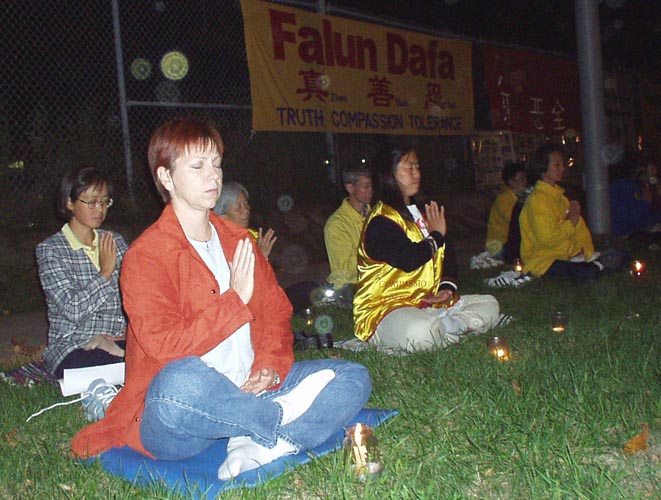 在炼过一遍动功后,学员们在静谧的烛光下,齐发正念除恶。然后,学员用中英文两种文字,先后向中国大使馆郑重宣读了《法轮功学员要求停止国家恐怖主义》声明,“辽宁省一法轮功女学员被警察自四楼窗户扔下活活摔死”,以及“加议员说中共镇压法轮功是国家恐怖主义”的新闻报道。声明指出:“迫害法轮功学员的一切行动都是江XX的指令,由中央、省、市各级“610”办公室执行。”“在过去两周里,法轮功修炼者在监禁期间被报道的死亡人数已超过20人。几乎所有的死亡都被诬陷为‘自杀’或‘自然原因’。”声明并呼吁下月出访中国的加拿大总理克瑞强“显现和平保卫者的本色,站在正义一边,代表加拿大人民发声,严厉谴责江泽民对法轮功学员实施国家恐怖主义。”