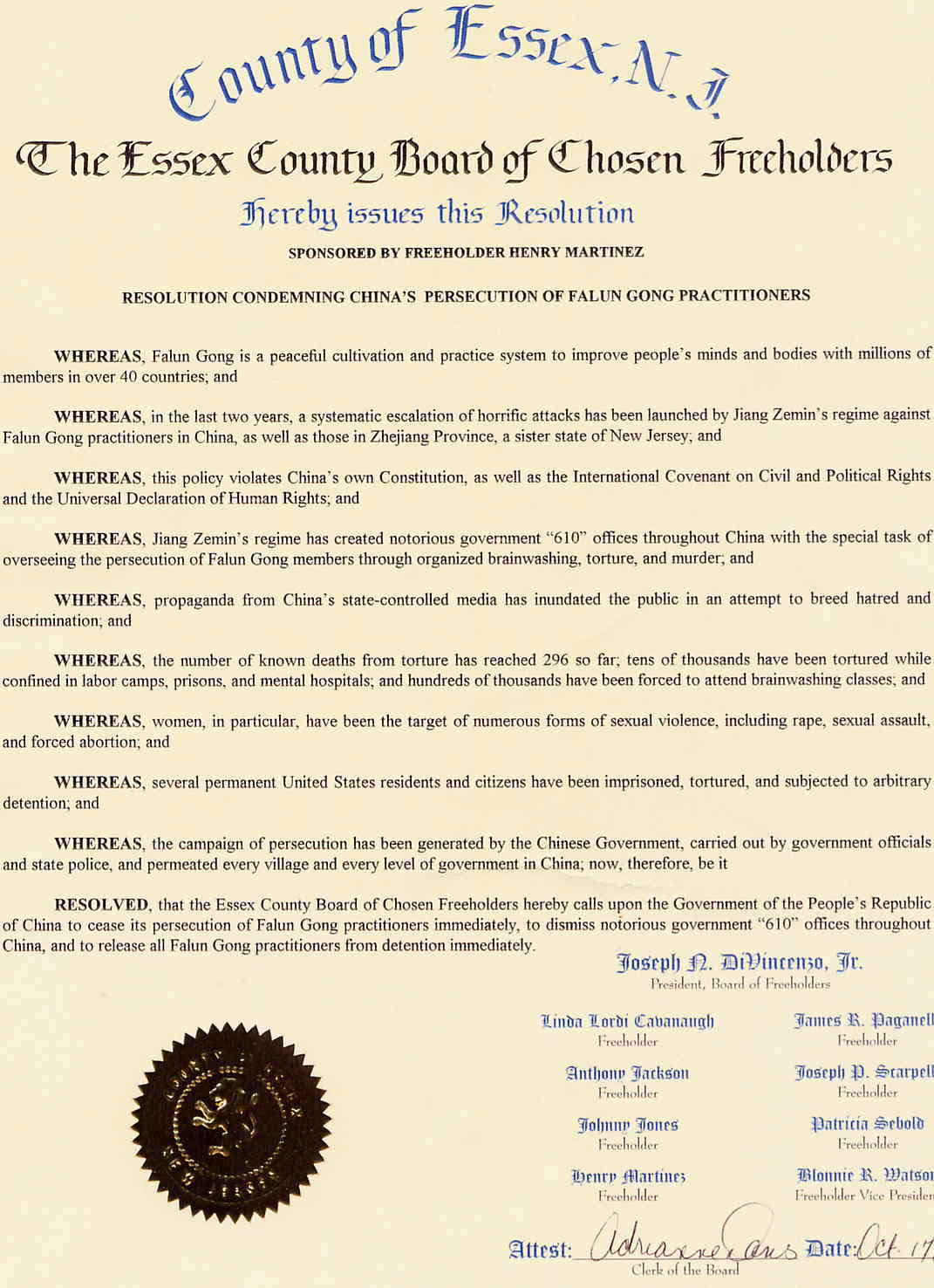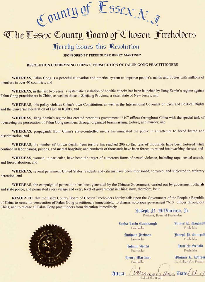鉴于,在过去的两年里,江泽民政权对包括新泽西州在中国的姐妹省--浙江省在内的中国法轮功学员发动了系统化的,不断升级的恐怖迫害行动;并且,
