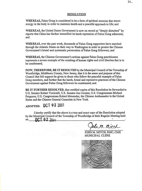 继新州著名的爱迪生市,新州最大城市泽西市和纽瓦克市及其它数个城市后,10月2日晚,新州第五大城市木桥市政府和议会一致通过关于“坚决支持法轮功并谴责中国(江泽民)政府严厉的,残忍的镇压手段”的决议。并把决议的副本及信函分别寄往中国驻美国大使,中国驻纽约总领事,新泽西州的两位联邦参议员和木桥市所在选区的两位联邦众议员,以表达木桥市市长,市议会和全体市民对发生在中国的对法轮功修炼者残暴镇压的深度关切与谴责。同时还将把决议副本寄往中国总理,新泽西在中国的三个姐妹城市的市长─石家庄市长、南通市长、徐州市长。