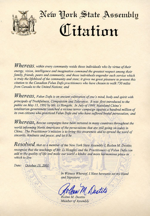 【明慧网2001年10月23日】2001年10月19日,加拿大蒙特利尔──渥太华──纽约的SOS步行学员来到纽约州尤提卡市,纽约州女众议员珞安德斯泰特(RoAnn Destito)出席了市府门前的新闻发布会并宣读了她签署的褒奖令。