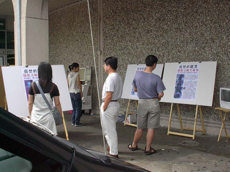 有一组刚从中国大陆来的人,路过展板时,非常吃惊:“呀!是法轮功!”然后紧张而认真地看起来。对他们讲真相时,他们都一言不发,看得出是出国前“教育”的结果,但是,展板和录像一定给他们留下了深刻的印象。