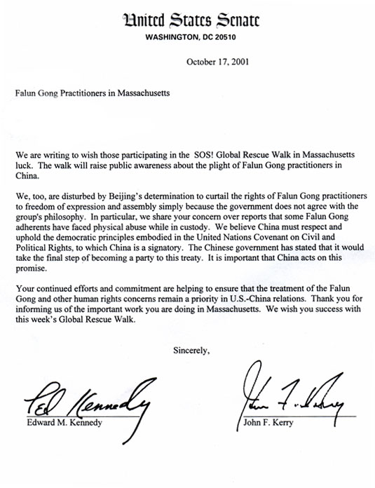 你们不懈的努力正在帮助确保中国对待法轮功及其他人权问题成为中美关系中的优先问题。谢谢你们让我们了解你们在麻州做的重要工作。我们祝愿你们此周的全球紧急救援步行胜利成功。