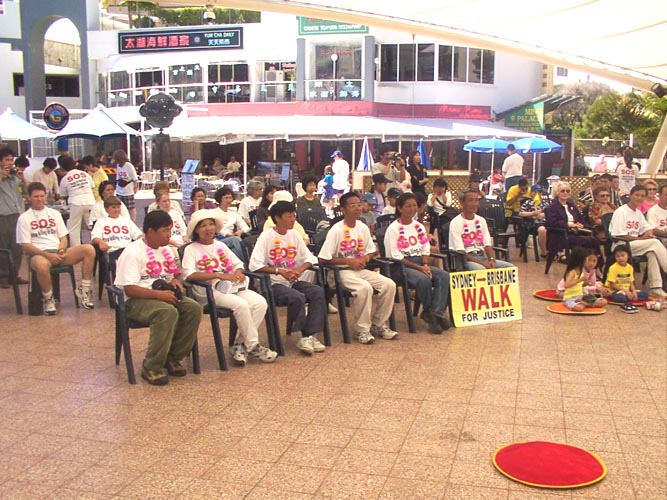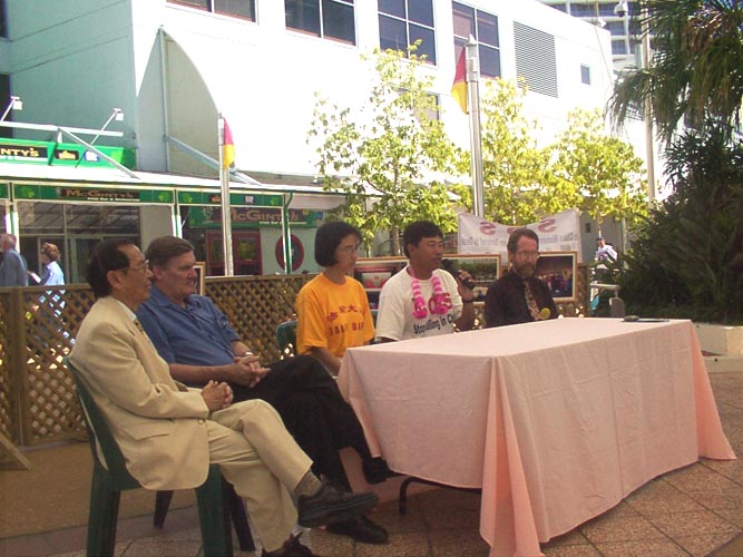 步行弟子鲍伯在会上发言,讲述了他于2000年元月,在中国大陆上访时,在宾馆被抓,被无辜关押在拘留所、劳教所的半年期间,被逼写“决裂书”,但自己坚决不放弃“真、善、忍”的信仰,而遭到4万伏高压电击身体敏感部位,持续10多分钟的酷刑折磨。他说:在中国大陆,被无辜关押的无数的法轮功修炼者,分分秒秒都在承受着这种生不如死的残酷迫害,他希望通过自己的行走,能呼吁澳洲政府和善良的澳洲人民,共同制止在中国的虐杀和迫害。