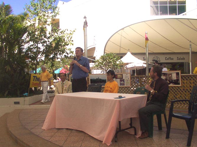 黄金海岸市议员爵克先生与步行弟子握手,欢迎大家的到来,并祝步行的成功。随后大家一起合影留念。接着,议员爵克先生在新闻发布会上讲话,支持并赞扬大法弟子的“SOS紧急救援长途步行”行动,以这样一种和平方式对中国大陆法轮功的人权呼吁,他说:“中国当局对法轮功的镇压,是野蛮的、不人道的。”