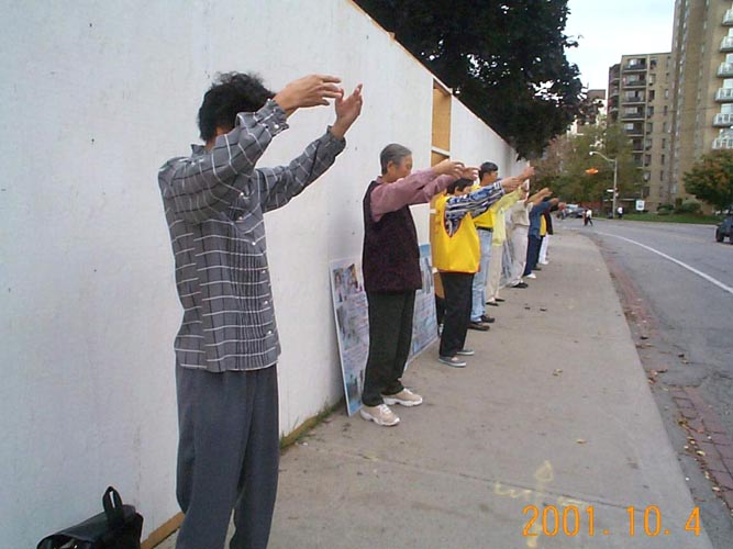 在这里我们正告多伦多总领馆,停止骚扰海外法轮功学员,帮助制止发生在中国的镇压法轮功运动,不要再做江泽民、罗干之流的帮凶了。如再执迷不悟,只能做江罗之流的陪葬品。