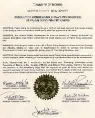 为此,新泽西州摩利斯郡摩利斯市市长和市议会决定:本政府机构全力支持那些以平和的法轮功学员为榜样的人们,谴责中国政府对法轮功学员的残酷迫害和镇压。