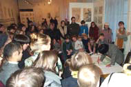 上午一群东方艺术中心的学生在老师的带领下来参观画展,其中有个孩子把我领到大佛的画像前,好奇地问了很多问题。参观后,他们的老师邀请我们第二天去他们艺术中心教他们炼功,我们欣然接受了邀请。