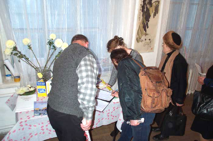 参观者们都拿到了SOS真相报纸,很多人都在支持法轮功的征集签名簿上签了字。因为来参观的人太多, 学员们全都忙着向人们介绍大法与在中国正在进行的迫害,放签字簿的桌子旁已经没有大法弟子值班了,可是放签字簿的桌子前却经常能看到参观者为等待签名表示支持法轮功而自觉排起来的队伍。甚至有些人只是偶尔听到了学员向其他参观者讲述关于迫害法轮功的事时, 自己就主动走到签字簿旁签字表示支持法轮功。还有什么能比看到一个生命正确摆放了自己将来的位置更让人高兴的呢。