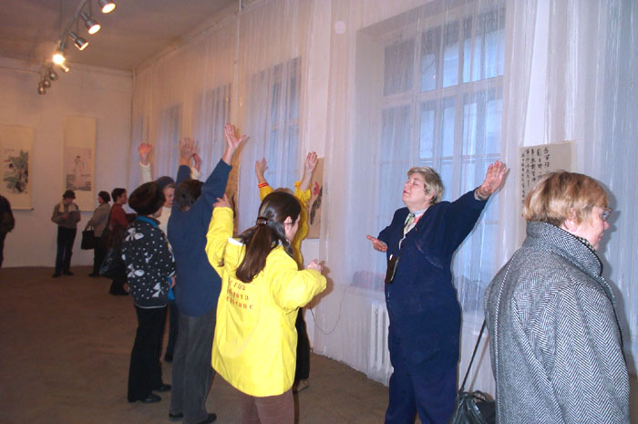 参观画展的人络绎不绝。好多人都说一进展厅就有一种特殊的感觉。有的说每幅画都那么善良,都在对他微笑;有的说能感受到画在发出能量;有的说这个大厅里怎么这么祥和舒服,看完了画也不愿离去;有人问是什么力量使画家能画出这么好的画来。当然我们知道这都是大法的力量;展出的是大法弟子的画,现场又有很多大法弟子在洪法和讲清真相及表演功法,能量场当然非常强,佛光普照,融化着一切不正。