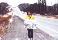 加拿大《莱斯布里奇先驱报(The Lethbridge Herald)》10月25日:风雪挡不住步行者。30岁的李和63岁的仲伟杰从卡尔加里一路步行至里贾那,以唤起公众对法轮功修炼及其在中国遭受迫害的关注。
