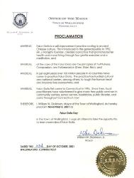 【明慧网2001年11月21日】康涅狄格州瓦林福德(Wallingford, CT)市长宣布2001年11月5日为该市“法轮大法日”。