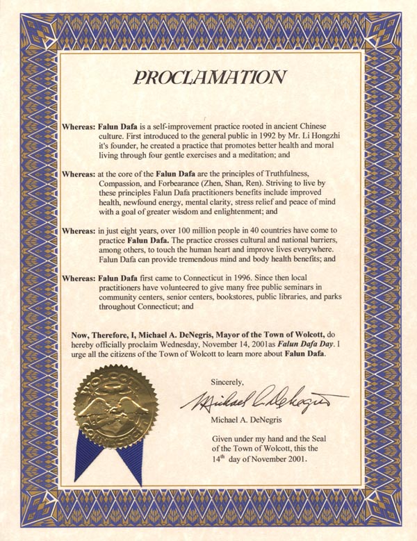 康涅狄格州渥尔考特市(Wolcott, CT)市长宣布2001年11月14日为“法轮大法日”: