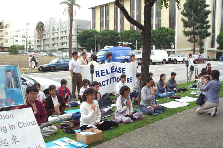 【明慧网2001年11月22日】得悉有三十多名来自十二个国家的西人法轮功学员20日下午(北京时间)在天安门广场为被中国政府镇压的法轮功请愿而遭到拘留,洛杉矶大法弟子于当地时间11月20日下午两点在中国驻洛杉矶总领馆前紧急召开新闻发布会,向中西方媒体披露这一事件,同时宣读了一位来自当地的一名美籍和以色列籍的大学一年级学生的声明,并要求中国立即释放被拘留的西方法轮功学员。